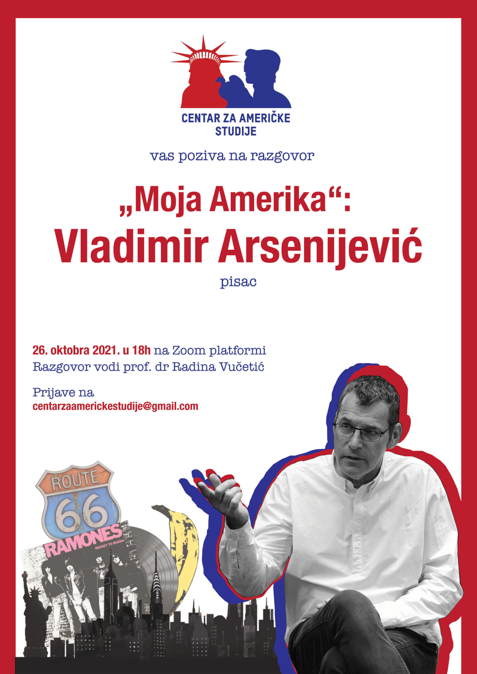 Tokom razgovora novog ciklusa serije „Moja Amerika“ Vladimir Arsenijević je sa prof. dr Radinom Vučetić pričao o njegovim prvim kontaktima sa Amerikom, vesternima, kaubojima i Indijancima, američkoj književnosti, a pre svega Tomu Sojeru, kao i američkoj muzici i uticaju američke pank scene na Jugoslaviju. Vladimir Arsenijević se osvrnuo i na svoja putovanja po Americi –- Njujorku, Las Vegasu i Los Anđelesu.